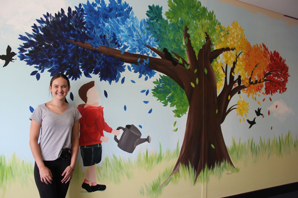 The piece represents growth and the idea that "everything is going to be ok". The inspiration for this came from the area that the mural is painted in, being a space of wellness and healing. I thought for this piece that it would be nice to include a small child watering something much greater than himself, symbolizing that something or someone small is capable of great things, and I thought this was a lovely message to spread to students. The piece includes leaves that are the colours of the School Houses, so that all students can relate to the piece. The birds around the tree are a symbol of hope, again in keeping with the wellness area. I am hoping this piece will bring calm and happiness to students that use the space.